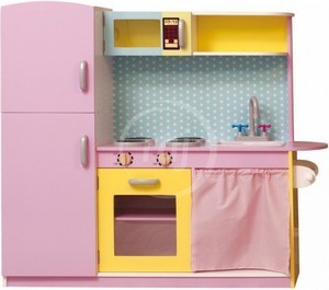 Sada mozete kuvati u ovoj odlicno pripremljenoj kuhinji. Drvena kuhinja pastelnih boja dizajnirana od strane Britta Hurter, napravljena je od drveta i u ljubicastoj boji. Vrata se otvaraju na magnet i zvuče i izgledaju autentično. Prikladno za uzrast 3+
